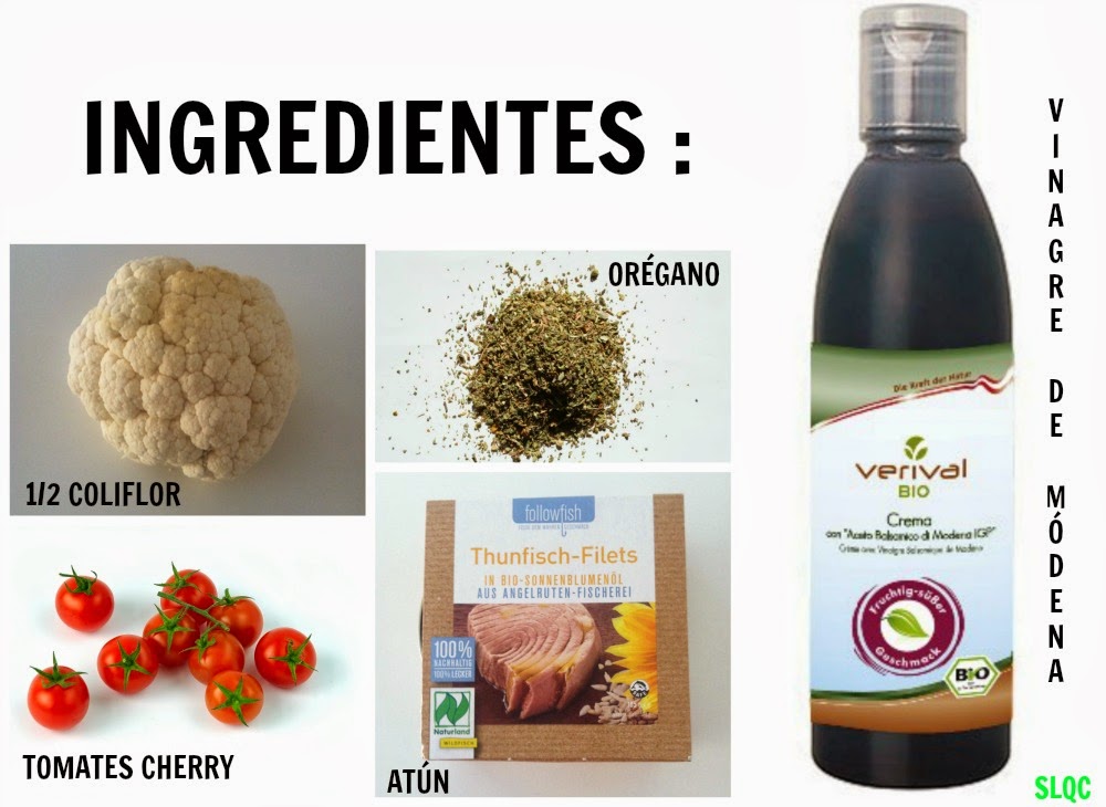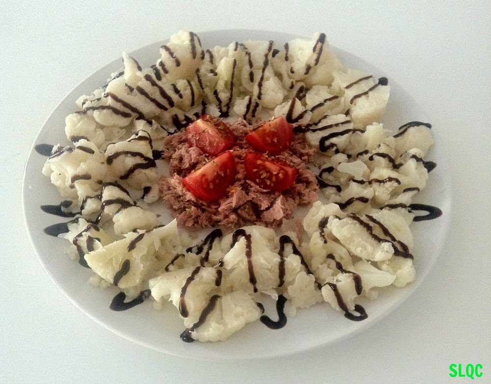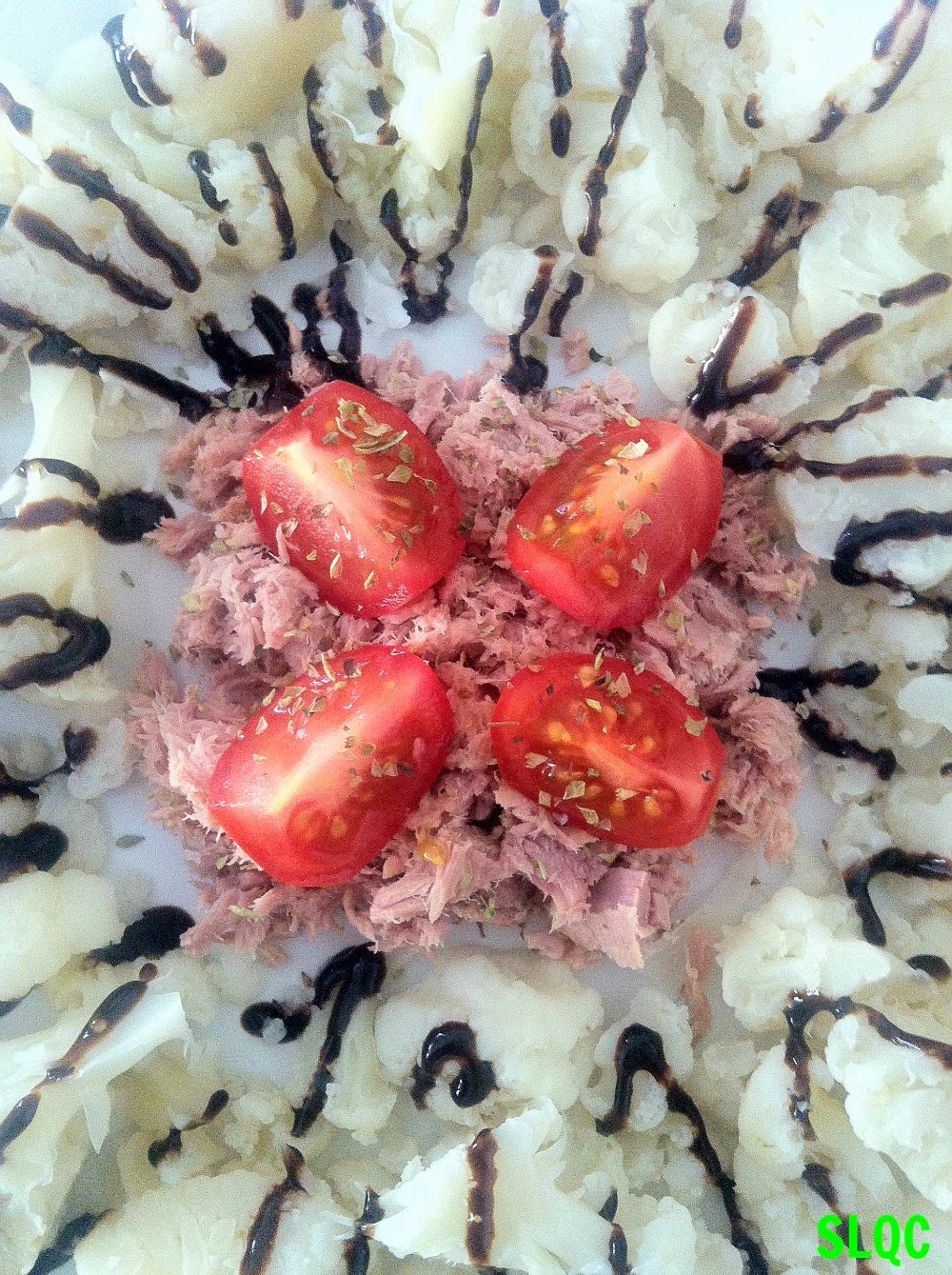 3º. Mientras se hace la coliflor escurrimos bien al atún y lo colocamos en el plato junto con los tomates y el aliño que prefiráis, en mi caso tan solo le puse un poco de orégano