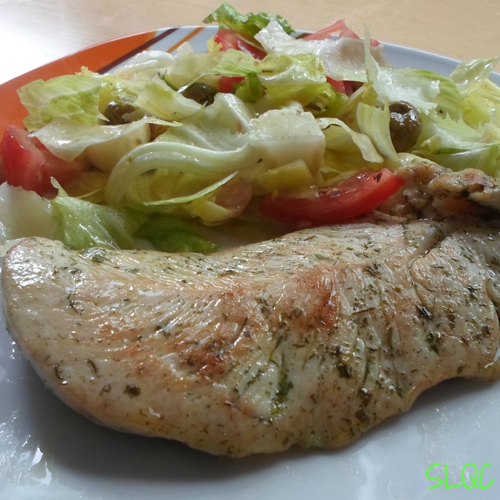 – Opción 2: ponéis en un lado del plato la ensalada aliñada y en el otro la pechuga de pavo