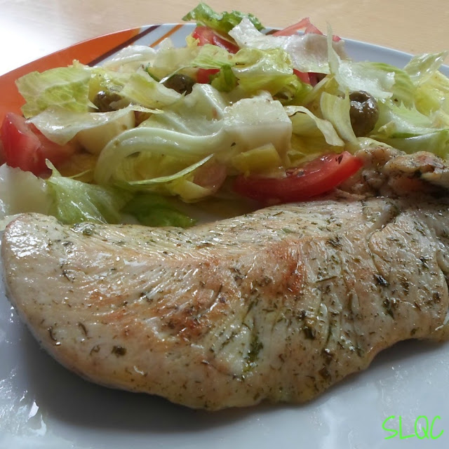 Laváis bien todas las verduras, las cortáis al gusto y montáis la ensalada mientras hacéis a la plancha el pavo.