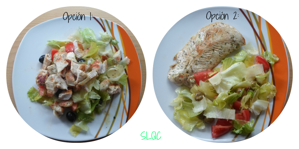 – Opción 1: ponéis la ensalada por todo el plato, la aliñáis y ponéis encima la pechuga de pavo troceada