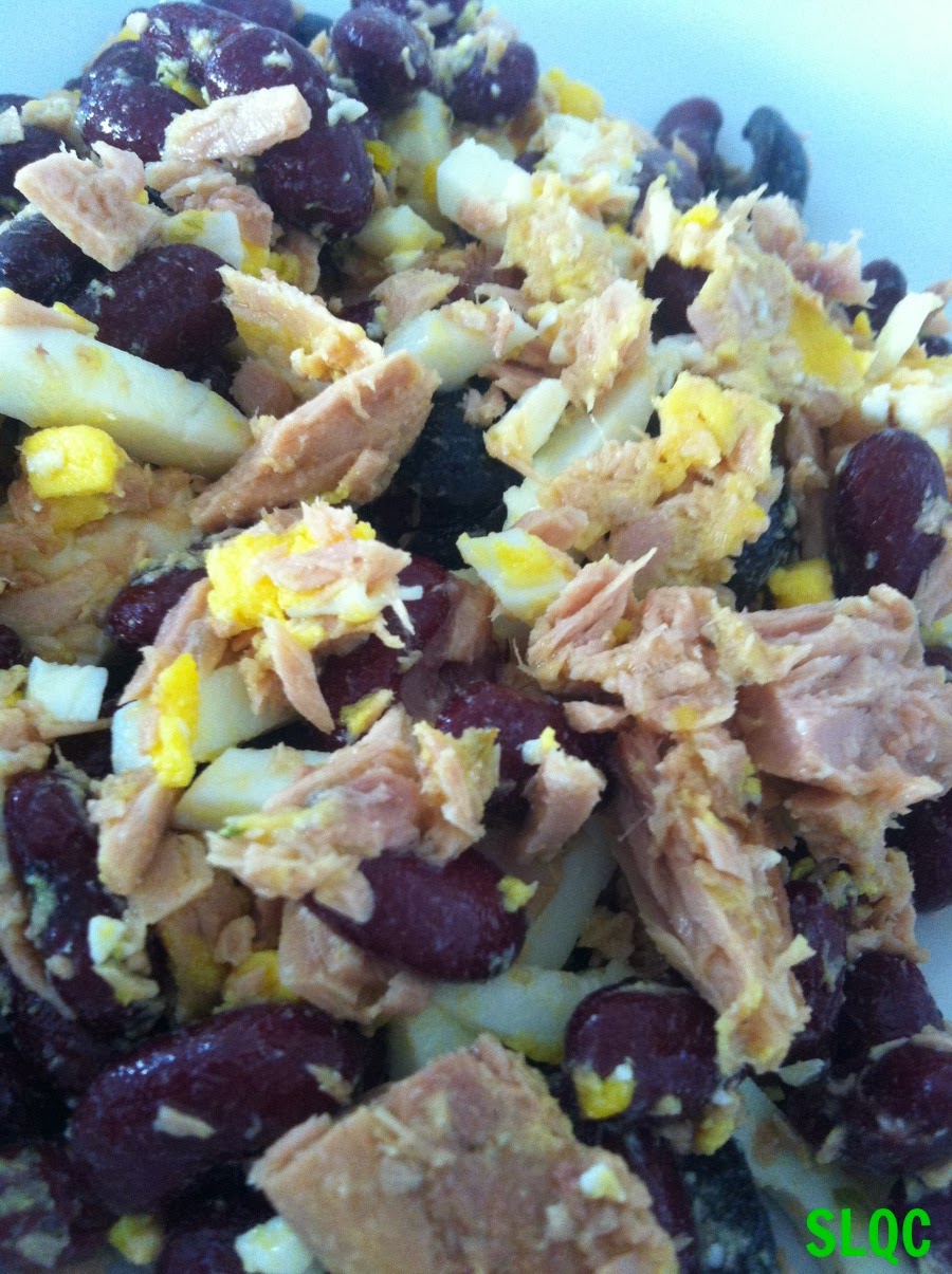 Para preparlo, muy fácil. Ponemos en un bol las judías, junto con el atún, el huevo duro rayado o cortado, las olivas negras cortadas y el queso feta cortado a dados. También se le puede poner maíz, tomate, cebolla, etc… Y si queréis luego lo podéis aliñar con un poco de aceite. Yo en Barcelona no lo aliñaba porque lo hacia por la mañana antes de irme a trabajar y con el suco del tomate y el huevo duro tenía suficiente, pero he de confesar que a la hora de comer me encantan las cosas sosas.