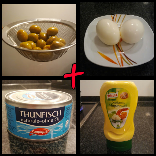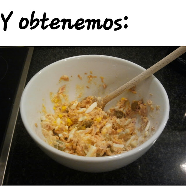Primero de todo mezclaremos las olivas, con el atún, los 2 huevos duros y mayonesa