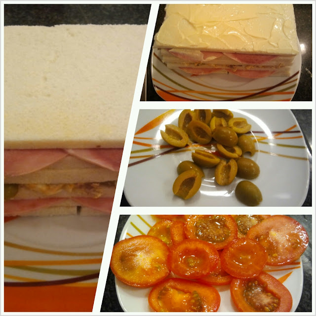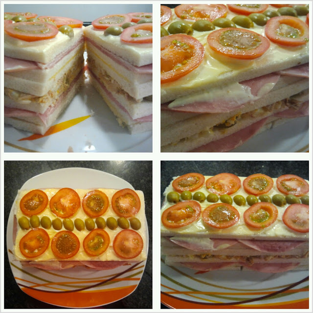 Una vez tenemos lista la mezcla pasamos a montar el pastel. Ponemos en el molde una capa de pan bimbo, luego una de jamón york, una de bimbo, una de queso, una de bimbo, una de la mezcla, una de bimbo, una de york, una de queso y acabamos con una de bimbo.